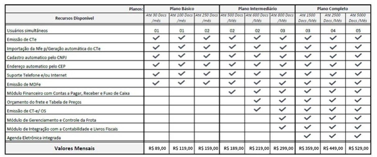 Planos de preços do Sistema CTePlus
